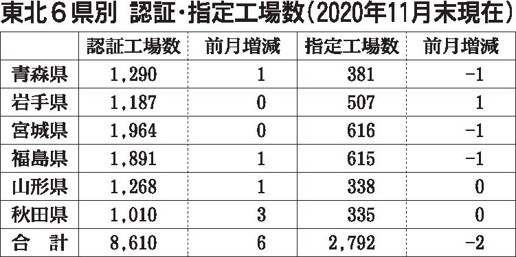 〈東北6県別 認証・指定工場数(2020年11月末現在)〉