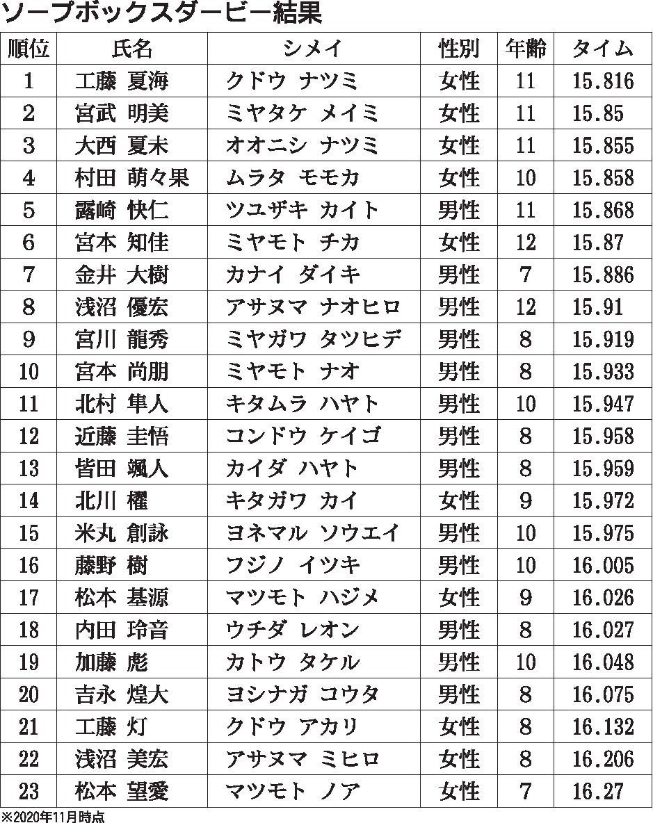 NPO法人日本ソープボックスダービー協会(阿野安雄理事長)は、「2021ソープボックスダービー ナショナルチーム選考会(神奈川大会)」を、横浜市旭区のよこはま動物園ズーラシア北門駐車場特設コースで開催した。子どもたちが自身の体重と車重を動力にタイムを競うレースで、8~13歳のパイロット23人が出場。同グランプリを通じ、子どもたちにクルマや競技の魅力を伝えるとともに、青少年の健全育成に努めたいとしている。レースの結果、小学5年生の工藤夏海選手が優勝に輝いた。(木下 采)