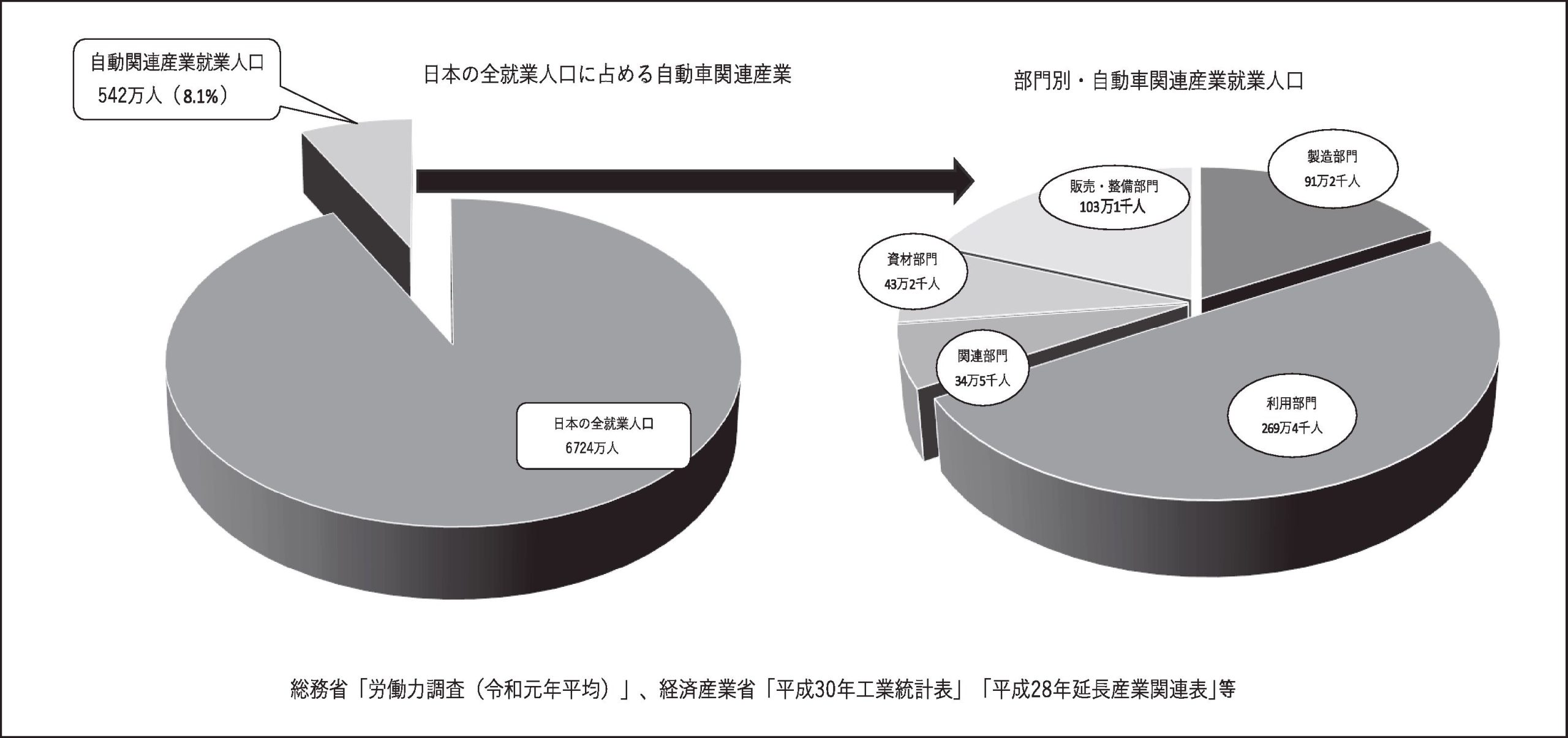 国内の自動車関連産業は約550万人の人材(日本自動車工業会調べ)が製造、販売、アフターサービスなど幅広く業種を横断して活躍し、日本経済の基盤を支えている。すそ野が広い自動車産業は、技術革新が進んでいく今後も、地域の移動を守り、経済の活性化や雇用維持に欠かせない基幹産業という役割を担うとともに、さらなる発展が期待される。
