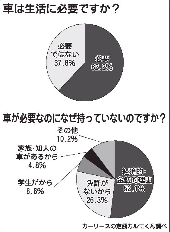 「クルマは生活に必要ですか」という問いに対して、「必要」が62.2%、「必要でない」が37.8%だった。必要と答えた中で、自家用車を持っていない割合は33.0%だった。理由については「経済的・金銭的理由」が52.1%と半数を占めた。「購入費用の工面が難しい」「保険など維持費がかかるから」といったコメントが多かった。次点で「免許がないから」が26.3%だった。