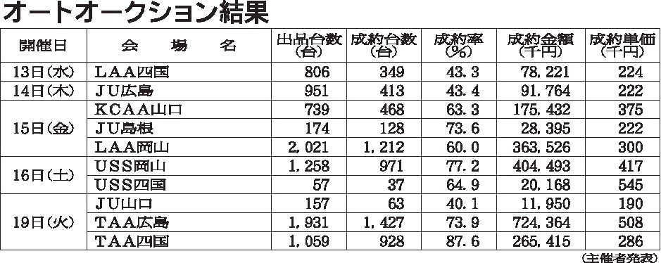 〈オートオークション結果〉中・四国地区 2021/1/13~19