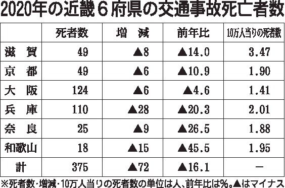 2020年(1~12月)の近畿6府県の交通事故死者数(24時間以内)は前年比16・1%減の375人だった。人数ベースでは72人減少した。全地域で死者数が減り、400人を割った。 減少率が最も大きかったのは和歌山県で45・5%減とほぼ半減し...