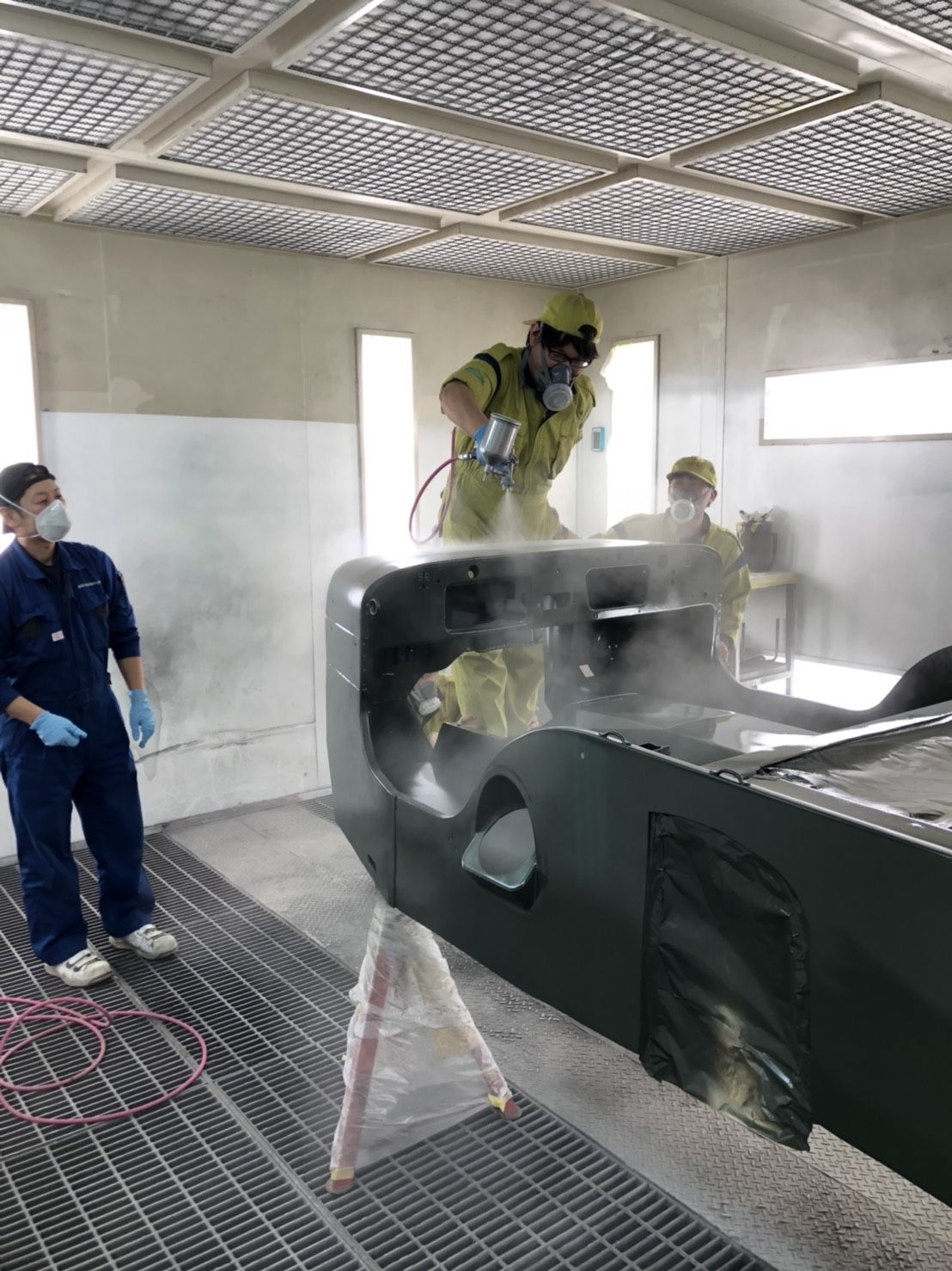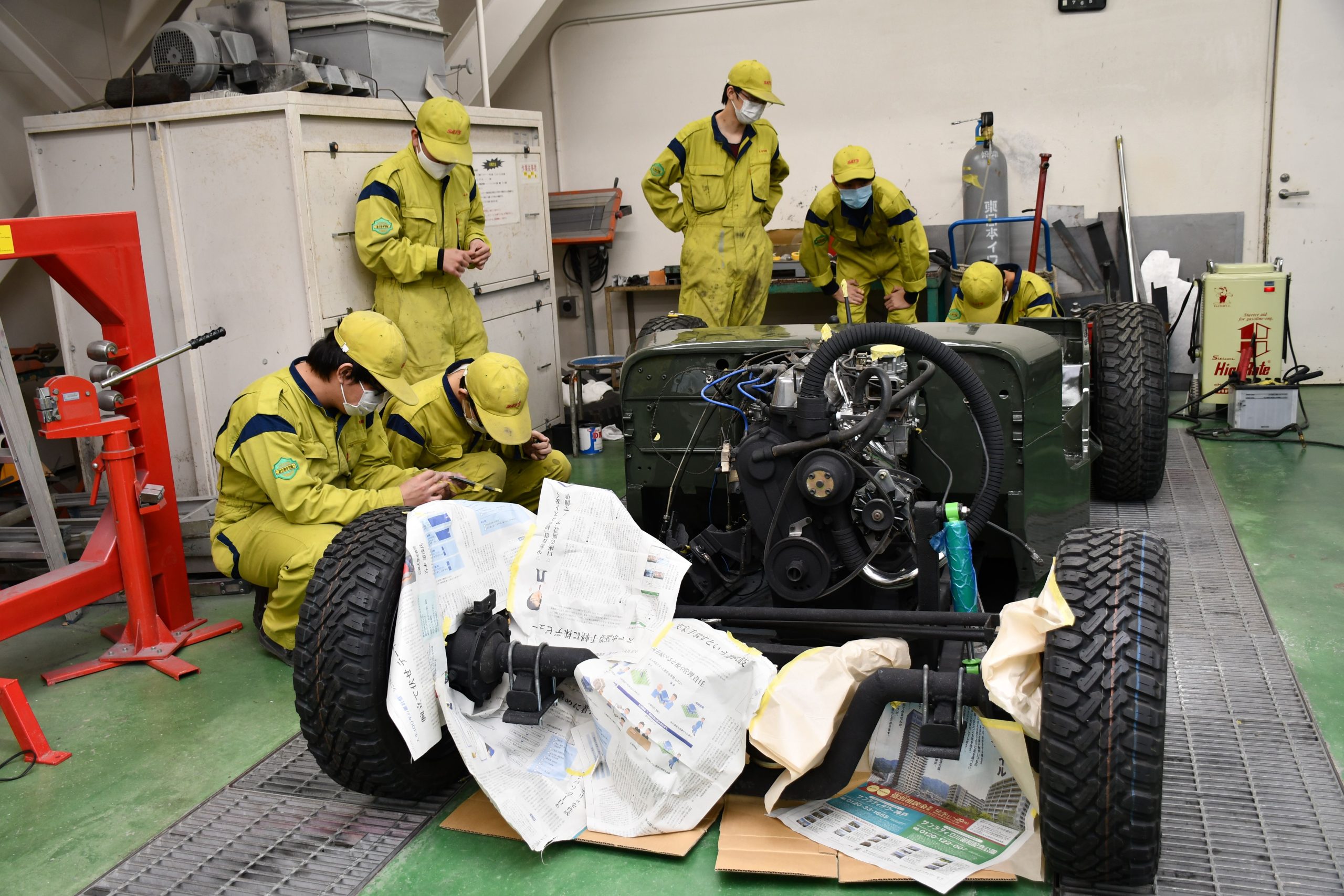ベース車両は昨年9月に調達。19人の学生の中から選ばれた統括リーダーの四条直輝さんが全体のスケジュール管理を行い、足回りや塗装など担当グループに分かれ、担当者同士が話し合いを重ねながら、製作を進めてきた。