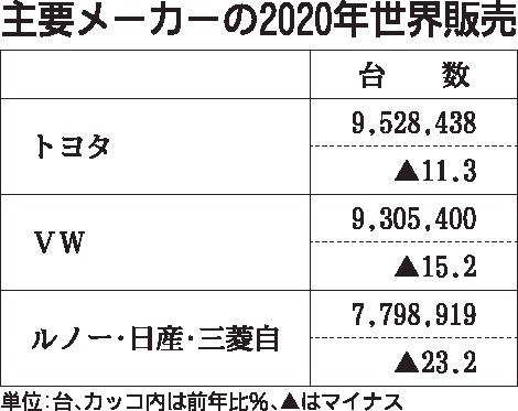 2020年の世界新車販売台数で、トヨタ自動車グループ(ダイハツ工業、日野自動車含む)がフォルクスワーゲン(VW)グループを抜き5年ぶりに首位となった。中国販売がけん引し、減少幅を抑えた。世界販売の合計はトヨタが同11.3%減の952万8438台、VWは同15.2%減の930万5400台だった。