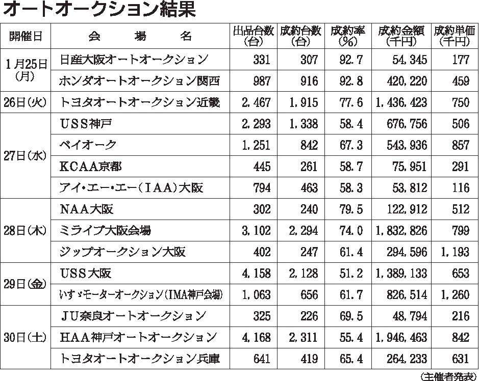 〈オートオークション結果〉近畿地区 2021/1/25~30