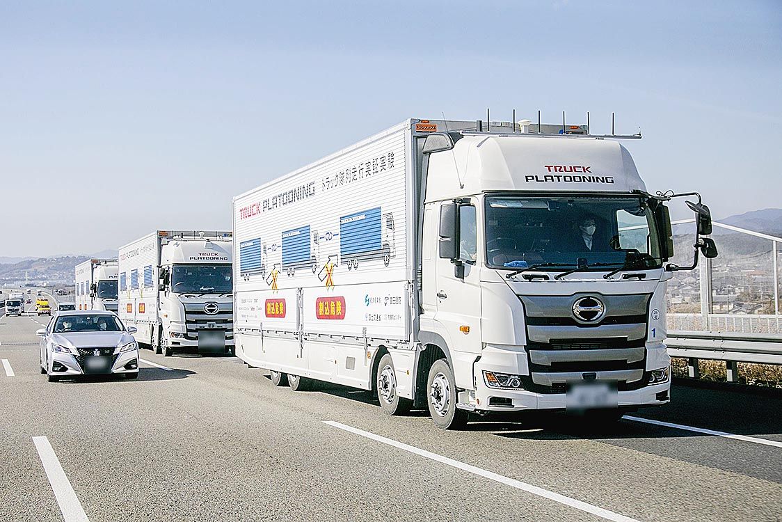 2月に新東名高速(遠州森町パーキングエリア~浜松サービスエリア間の約15キロメートル)で、「電子連結」と呼ばれる車車間通信技術を使い、大型トラック3台の車間距離を5~10メートルに保ったまま隊列走行させた。後続車2台の運転席には人を乗せず、万が一に備えて「保安要員」を助手席に待機させた。
