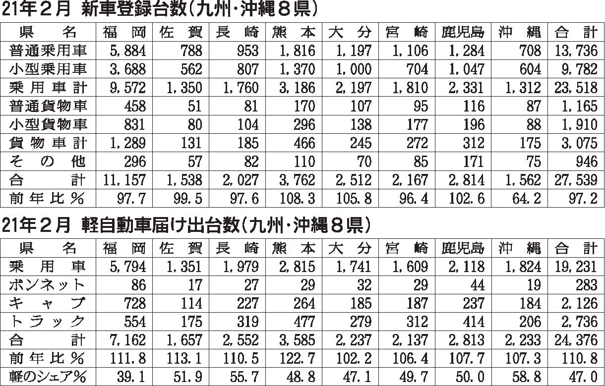 九州・沖縄地区の2月の新車販売台数は、前年同月比3・2%増の5万1915台となった。登録車は前年割れしたものの、軽自動車が2桁の伸びを示し、総台数では5カ月連続で増加基調を持続した。沖縄を除く7県が前年実績を上回った。伸長率は全国平均に比...