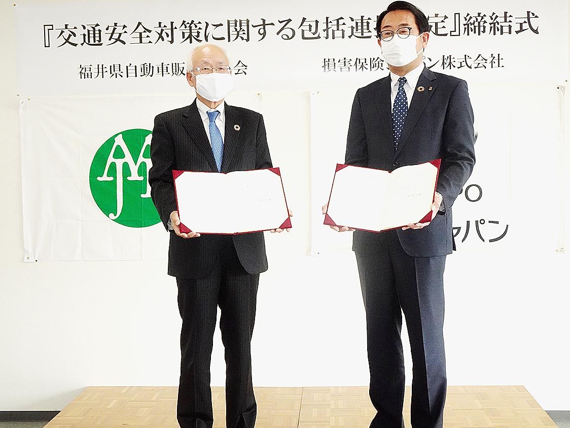 【福井】福井県自動車販売店協会(浮田啓三会長)と損害保険ジャパンは、損保ジャパン福井ビルで「交通安全対策に関する包括連携協定」を締結し、締結式を行った=写真。同協会の会員ディーラー20社に向けた講習を同社が行うほか、安全運転サポート車(サ...