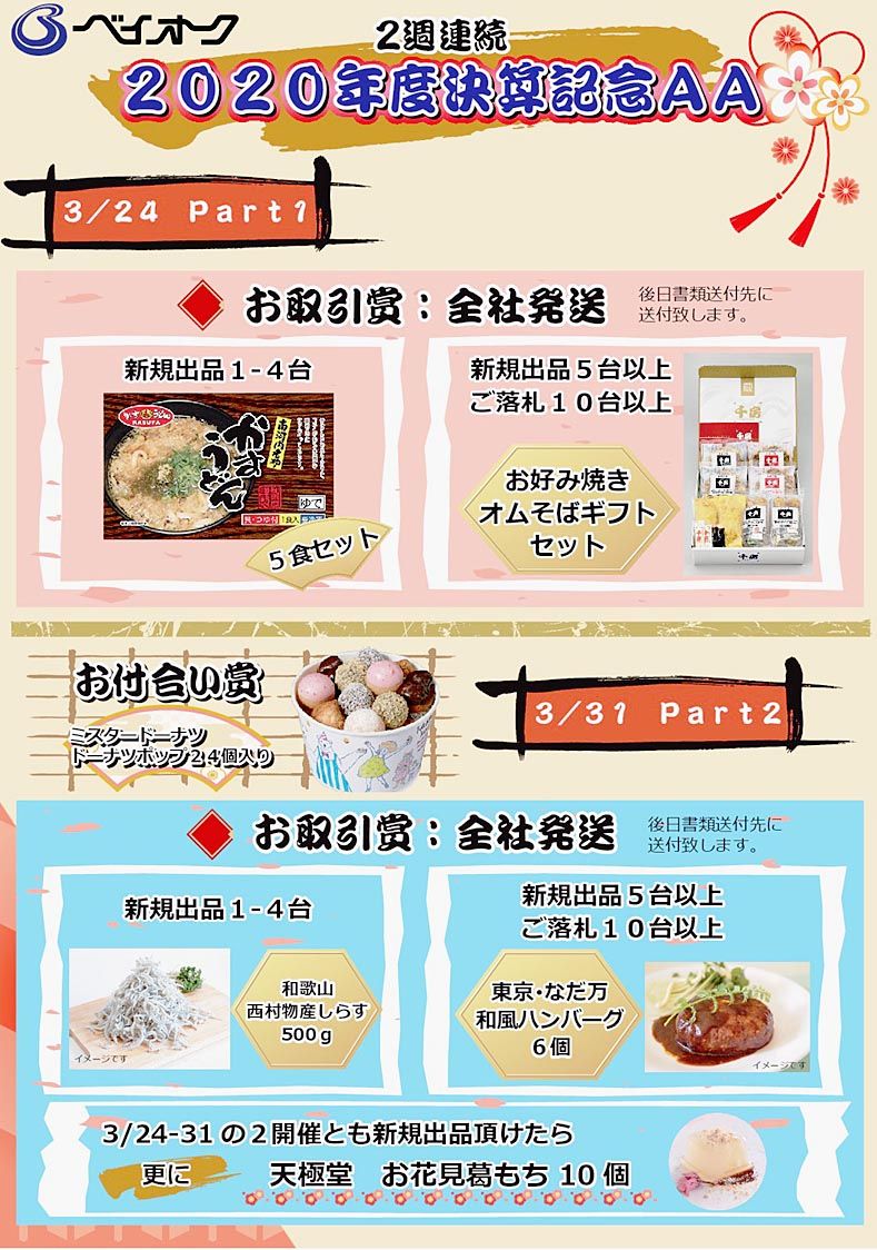 中古車オークション(AA)のベイオーク(塩原淳平社長、大阪市住之江区)は24、31日の2週連続で「2020年度決算記念AA」を開催する。新規出品や落札の台数に応じた取引賞のほか、2開催とも新規出品した会員への賞品を用意し、決算期のAAを盛...