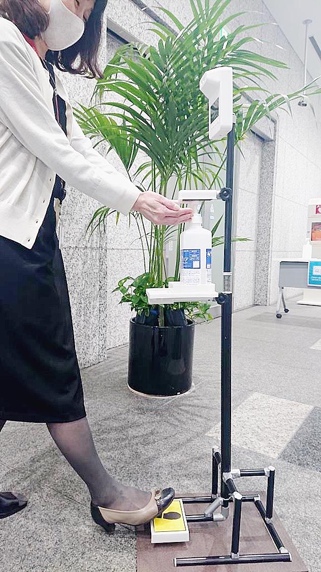 ○…ちょっとした工夫で消毒スタンドと検温器を一体化。トヨタモビリティ東京(TM東京、片山守社長)はトヨタ自動車の足踏み式消毒スタンド「しょうどく大使」と「非接触型検温器」を全230店舗に配備した=写真。コロナ禍の中でも来店客が安心して店舗...