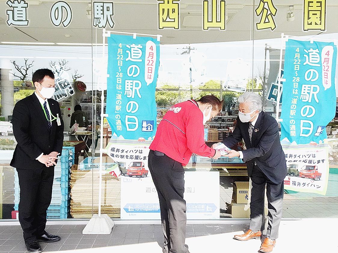 【福井】福井ダイハツ(山内克則社長)は、福井県「道の駅」連絡会に「道の駅の日」をPRするのぼり旗を寄贈した。同連絡会によると、県内の道の駅が民間企業と連携するのは珍しいという。同社は地域貢献の一環として道の駅の活性化を支援する。 道の駅西...