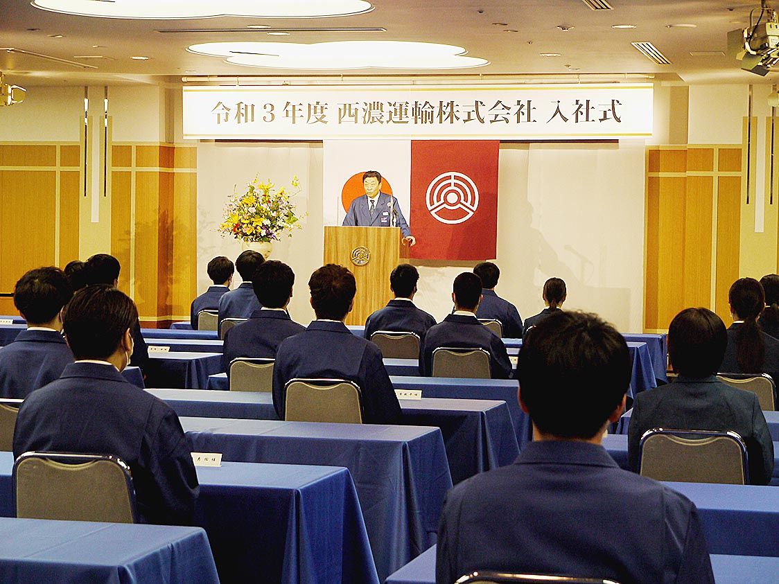 【岐阜】西濃運輸は1日、「令和3年度新入社員入社式」を大垣市内のホテルと全国12拠点をオンラインシステムで結んで開催した=写真。今年度の新入社員は総合事務職76人、営業乗務社員79人ら計164人。同社の役員や総合事務職の新入社員76人は会...