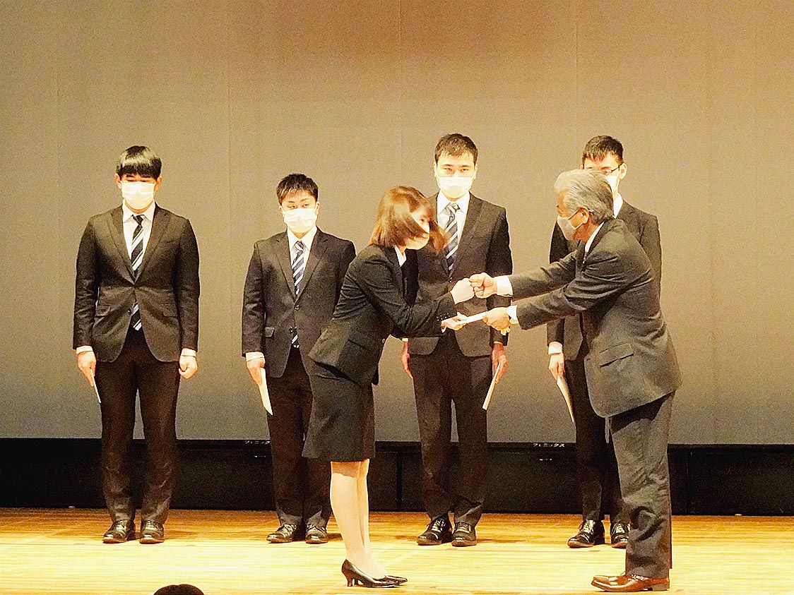 【福井】福井ダイハツ(山内克則社長)は1日、福井市のフェニックスプラザ(福井市民福祉会館)で開いた2021年度全社員大会の中で「入社式」を開催した=写真。今年は営業スタッフ1人、整備スタッフ3人、事務スタッフ1人(うち1人が既卒採用)の計...