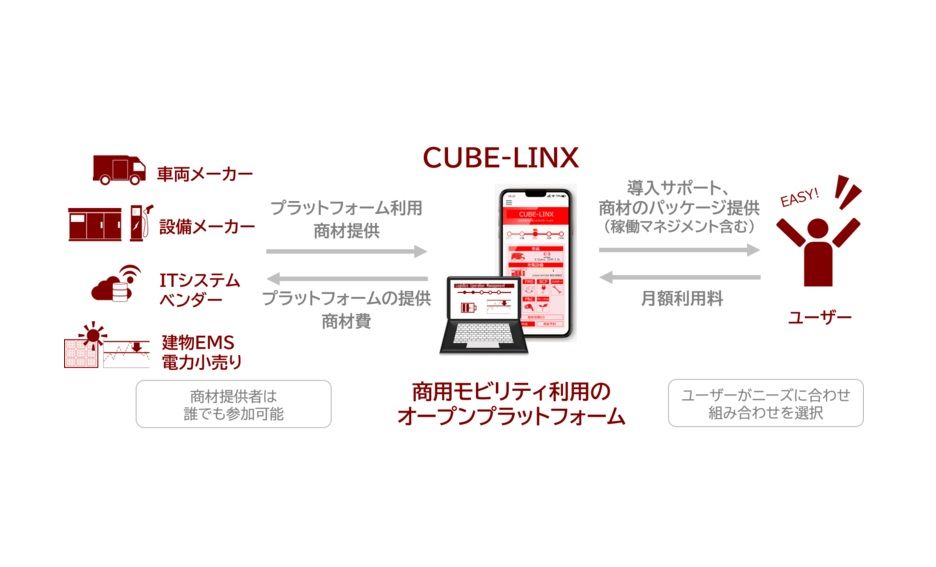 運輸事業者と車両・設備メーカーなどをつなぐサービスを提供する。物流事業者がEVを導入する際に必要な車両や充電設備、ITシステム、電力使用契約などをパッケージ化し、月額定額制サービスとする。