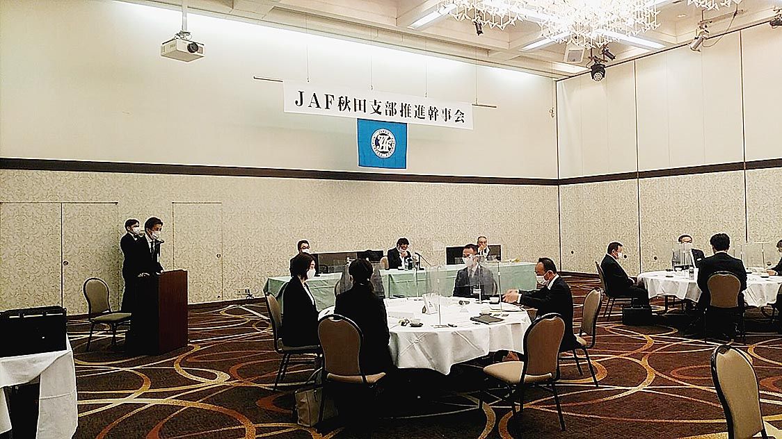 【秋田】日本自動車連盟(JAF)秋田支部(伊藤哲充支部長)は、秋田市で「第103回推進幹事会」を開催した=写真。伊藤支部長をはじめ、各社の推進幹事らが出席し、2021年年間表彰基準の中間報告などが行われた。会場は席ごとにパーテーションを設...