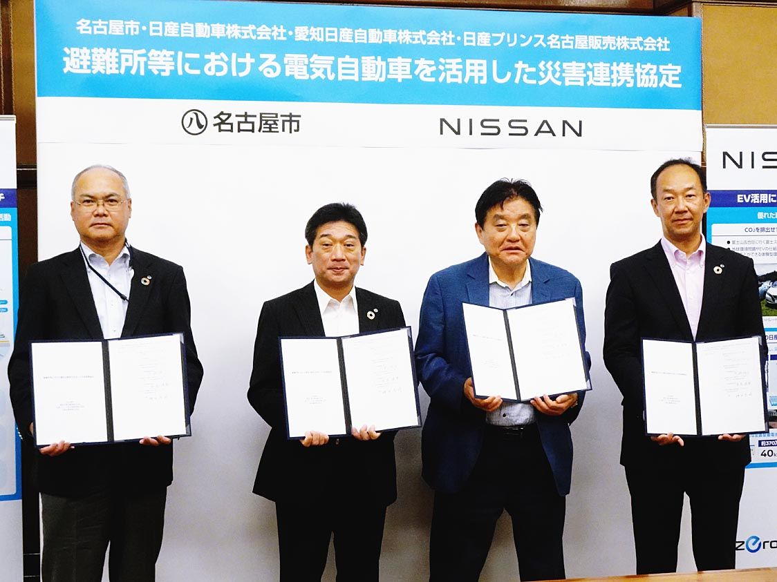 【名古屋】日産自動車と名古屋市内に拠点を構える日産販社2社は、名古屋市と災害時に電気自動車(EV)「リーフ」を無償貸与する協定を締結した=写真。協定により災害で停電が発生した時に、同車の給電機能で避難所などに電力を供給する体制を整える。日...