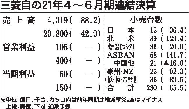 2021年4~6月期の営業利益は105億円(前年同期は533億円の損失)となり、20年1~3月期以来5四半期ぶりに営業黒字に転じた。構造改革の成果が107億円の増益効果となったほか、北米で発売した新型「アウトランダー」が好調に推移した。世界販売台数は前年同期比65.5%増の23万台だった。円安の増益効果も大きく、4~6月期の営業利益に118億円の増益効果をもたらした。