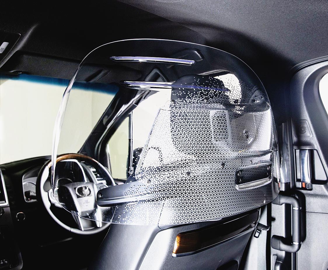 トヨタ紡織は13日、「飛沫防止パーティション」をタクシー事業者向けに先行発売した。今春から実証実験を続けてきた製品で、後席からの飛沫を防ぐほか、フィルター付送風ファンがエアシールドを形成し、飛沫の付着リスクを減らす。フィルターは食環境衛生研究所の試験で、浮遊ウイルスを99.9%以上、除去する効果を確認済みだ。先行販売の実績を踏まえて販売先を広げていく。