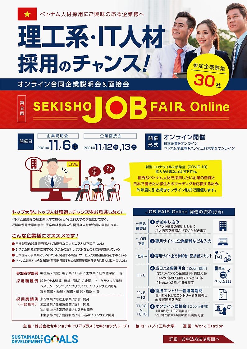 【水戸】セキショウグループ(関正樹社長)のグループ会社であるセキショウキャリアプラス(渡邊誠社長、茨城県つくば市)は、11月に優秀なベトナム人大卒人材の採用を行いたい日本企業と日系企業で働きたいベトナム人を対象としたオンライン形式の合同企...