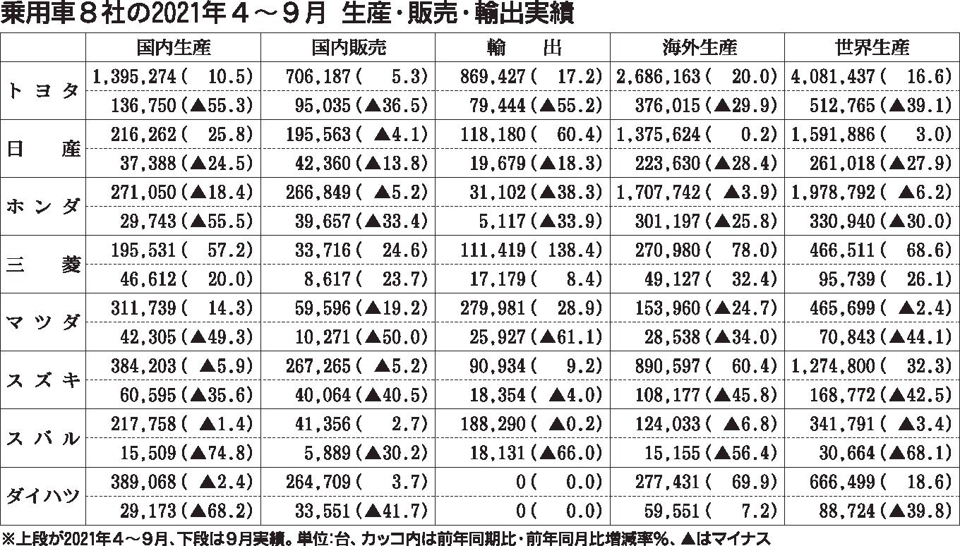 〈乗用車メーカー8社2021年4~9月実績〉トヨタ 海外販売24%増で過去最高