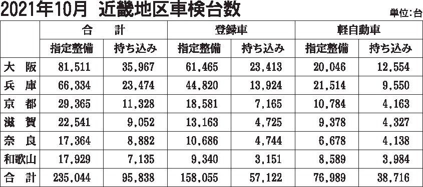 近畿2府4県の2021年10月の継続検査(車検)台数(軽自動車を含む)は、前年同月比8・6%減の33万882台となり、2カ月ぶりに減少した。登録車は同10・0%減の21万5177台、軽も同5・8%減の11万5705台だった。 対象台数が少...