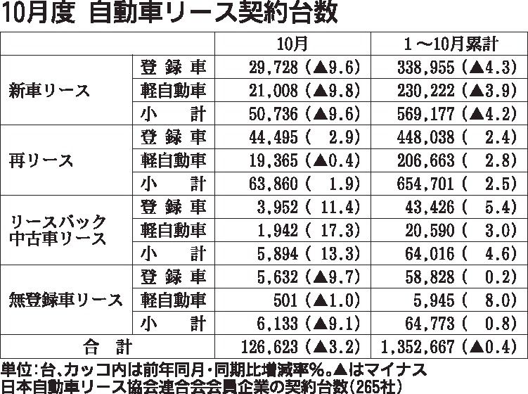 日本自動車リース協会連合会(JALA、上谷内祐二会長)がまとめた10月の自動車リース契約台数(会員分)は、前年同月比3・2%減の12万6623台で、2カ月連続の前年割れとなった。半導体不足などによって自動車メーカーが減産した影響で、新車リ...