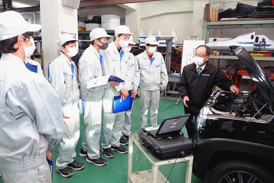 【岐阜】岐南工業高校は、岐阜市の同校で自動車科2年生を対象とした技術講習会を開催した=写真。岐阜スズキ(加藤孝廣社長)と高山自動車短期大学(坂井歩学長)から講師を招いて毎年行っており、同科の37人の学生はスズキ車に搭載される最新の技術や故...