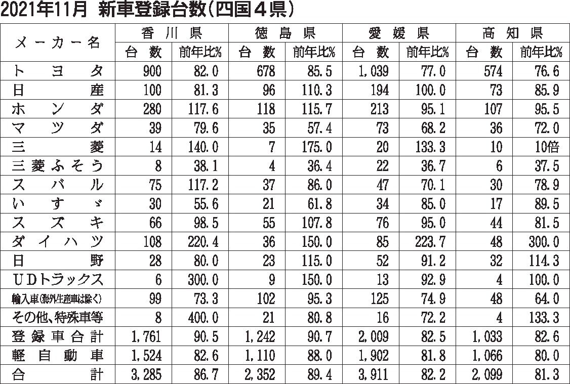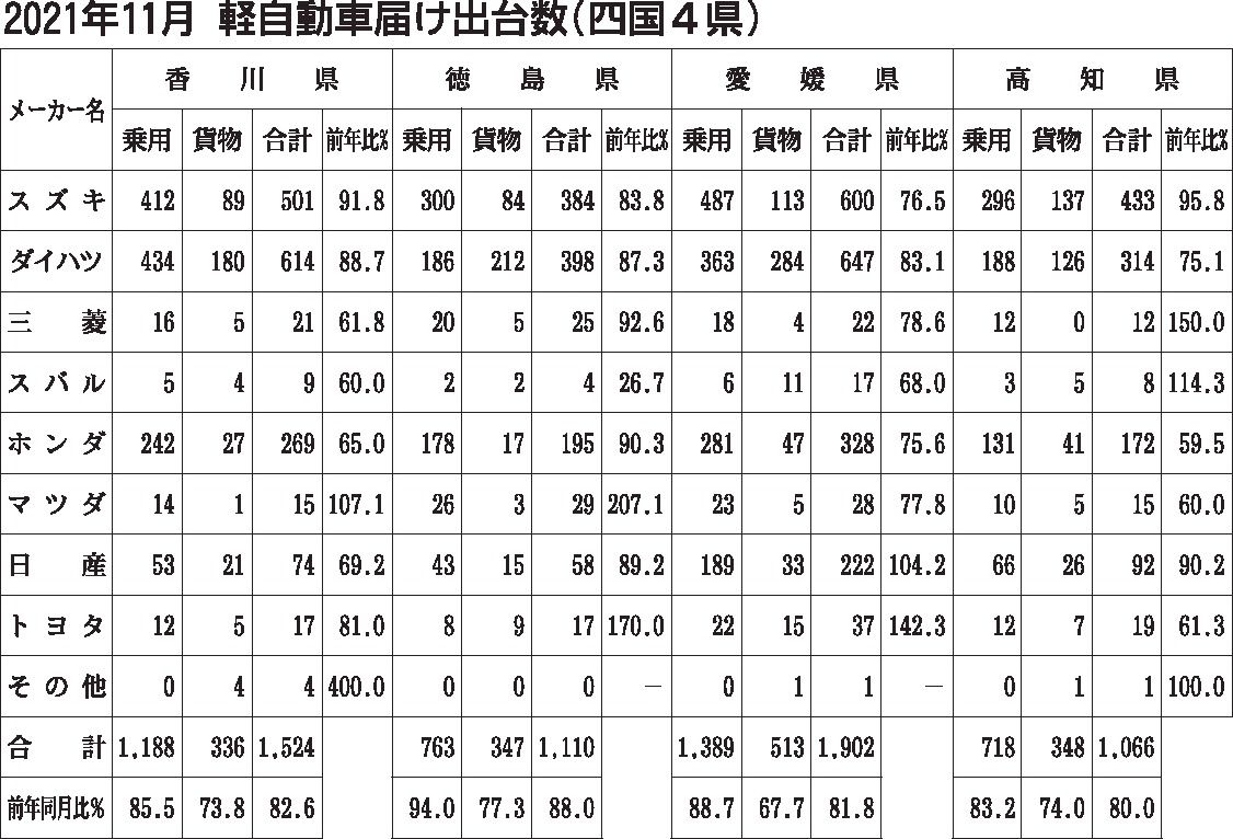 2021年11月の四国地区新車販売台数(含軽)は、前年同月比15・4%減の1万1647台となり、6カ月連続で減少した。9、10月に比べ減少幅は縮小したが、11月としては過去48年間で3番目の低水準だった。半導体など部品不足の影響による生産...