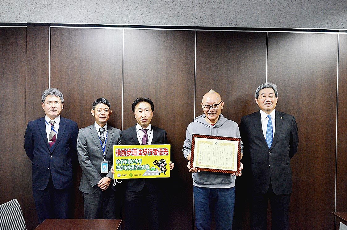 日本自動車連盟(JAF)宮城支部( ■(吉の士が土) 岡博文支部長)は、仙台市青葉区のエフエム仙台(小田桐和久社長)で番組パーソナリティーを務める本間秋彦さんに感謝状を贈呈した。本間さんは、リスナーに歩行者のいる横断歩道で一時停止を呼びか...