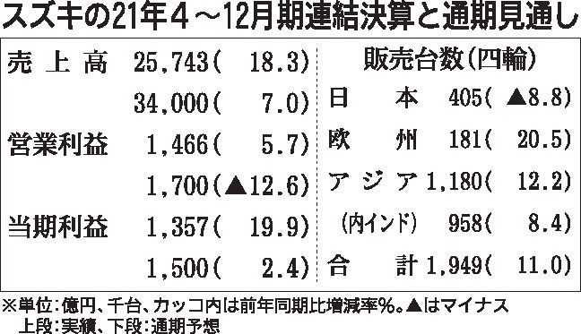 4~12月期の営業利益は、為替差益で323億円の増益効果があったものの、原材料価格の高騰で890億円の減益効果があった。四輪車の世界販売は同11.0%増の194万9千台と伸びたが、コロナ禍前の19年比では9.8%減にとどまっている。主力のインド販売は前年同期比8.4%増の95万8千台と好調。