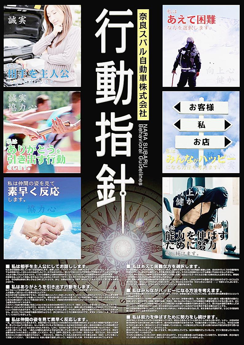【奈良】奈良スバル(高木信一社長)は、経営理念にある社員に求める人物像を達成するため、社員に6つの行動指針を設定して意識を高める取り組みを始めた。行動指針を各階層の行動レベルに落とし込み浸透させ、社員満足(ES)と顧客満足(CS)双方の向...