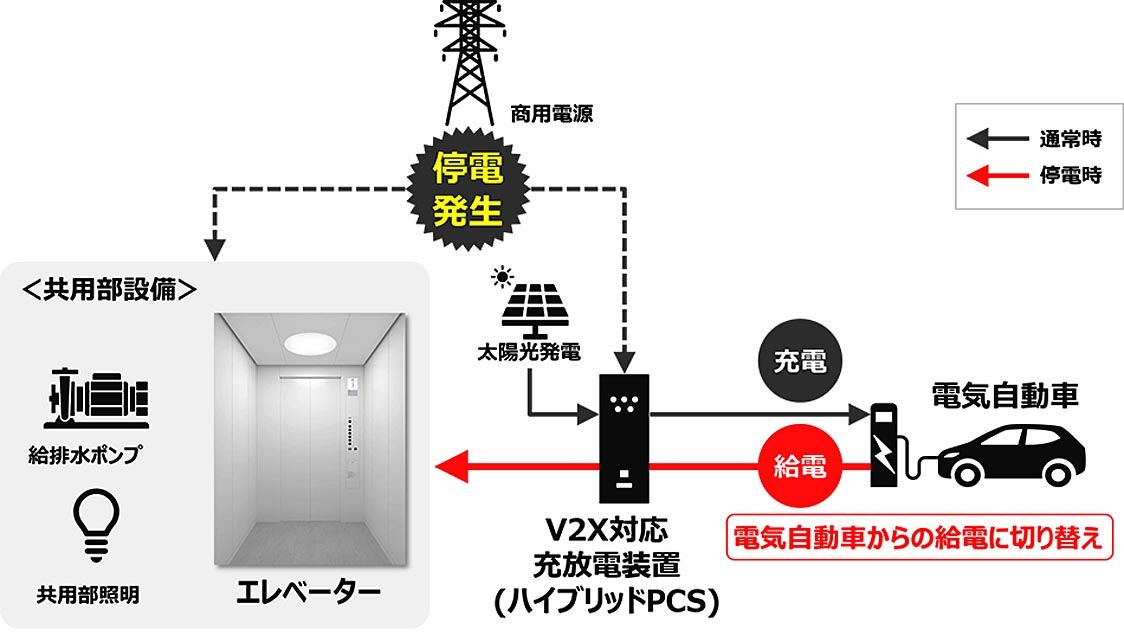 災害などによる大規模停電で、エレベーターなど社会インフラが長時間停止することが社会的な課題となっている。同社はEVとビルの電力の相互供給が可能なV2X(車車間・路車間通信)対応の充放電装置を開発した。
