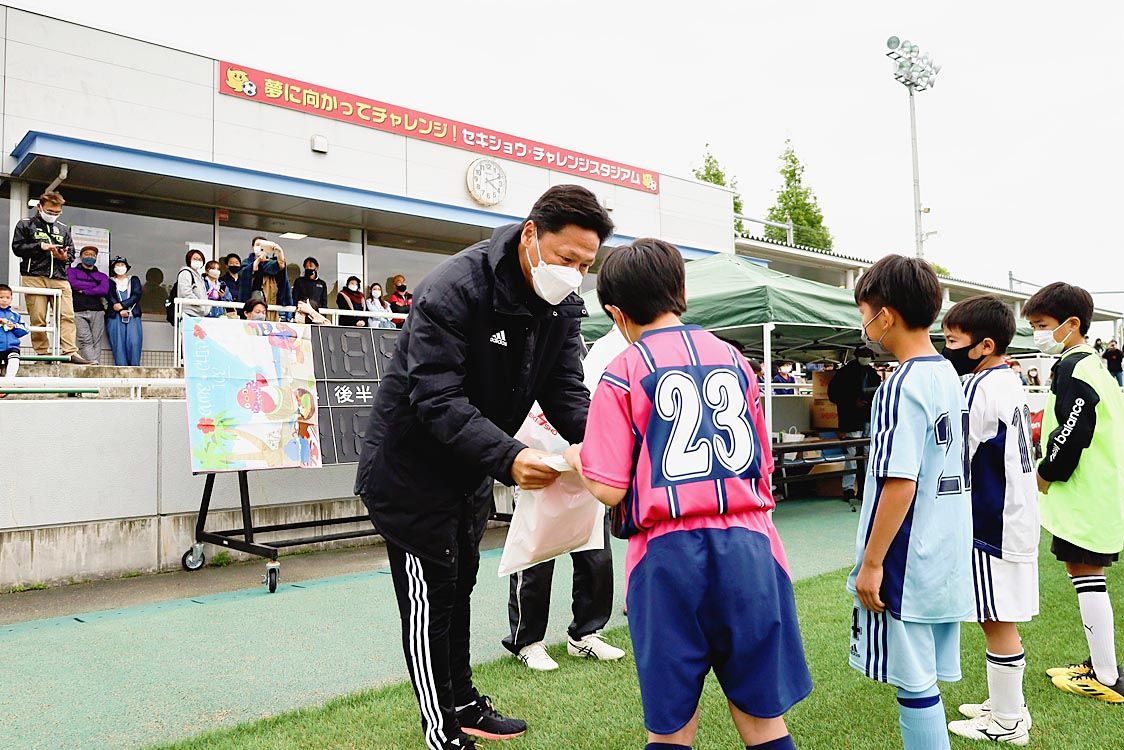 【水戸】関彰商事(関正樹社長)のスポーツアドバイザーであり、サッカーU―21の日本代表監督を務める大岩剛氏が、つくば市のセキショウ・チャレンジスタジアムで行われた「セキショウチャレンジシリーズ・JCカップ・U―10サッカー大会2022」で...