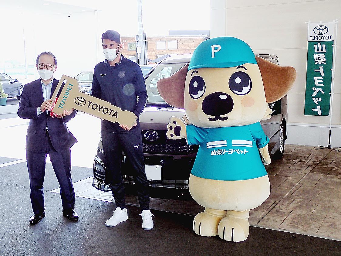 【甲府】山梨トヨペット(髙野孫左ヱ門社長)は、社会貢献の一環として、日本プロサッカーリーグ(Jリーグ)所属のヴァンフォーレ甲府(VFK)にトヨタ「ヴォクシー」1台を提供した。同社は車両提供も含めてVFKを応援しており、髙野社長がFWのブル...