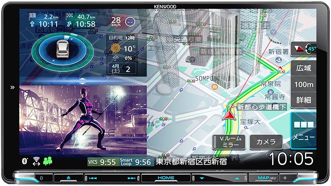 高精細ディスプレーを搭載し、緻密で滑らかな映像を体感できる。新たに「ワイヤレスミラーリング」に対応し、スマホの映像を無線通信でナビの画面上で再生可能とした。高音質化も図った。また、地図アイコンを分かりやすいデザインに改め、操作性も向上させた。新製品は画面サイズ9インチから7インチまでの4種を展開する。