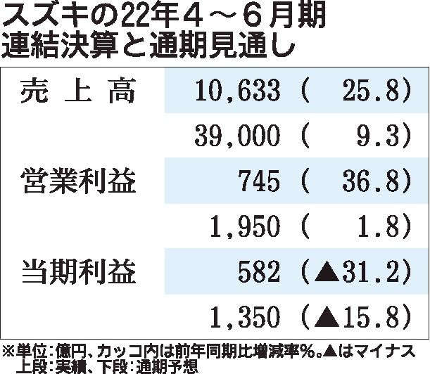 スズキが5日発表した2022年4~6月期連結決算は、純利益が前年同期比31.2%減の582億8300万円だった。前年同期は旧豊川工場跡地の売却益があった。営業利益は同36.8%増加した。インドなどでの販売増により原材料価格の高騰の影響をカバーし2期連続で営業増益となった。