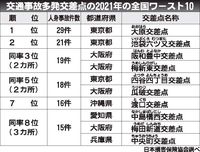 2位は池袋六ツ又交差点(東京都豊島区)の21件で、前年のトップ10圏外からランクインした。この交差点は国道254号に首都高速道路の支柱がある六差路で、支柱がドライバーの視界を妨げている。加えて、交差点が屈曲している構造であり、左右の確認不足に起因した事故が多数発生したとみている。