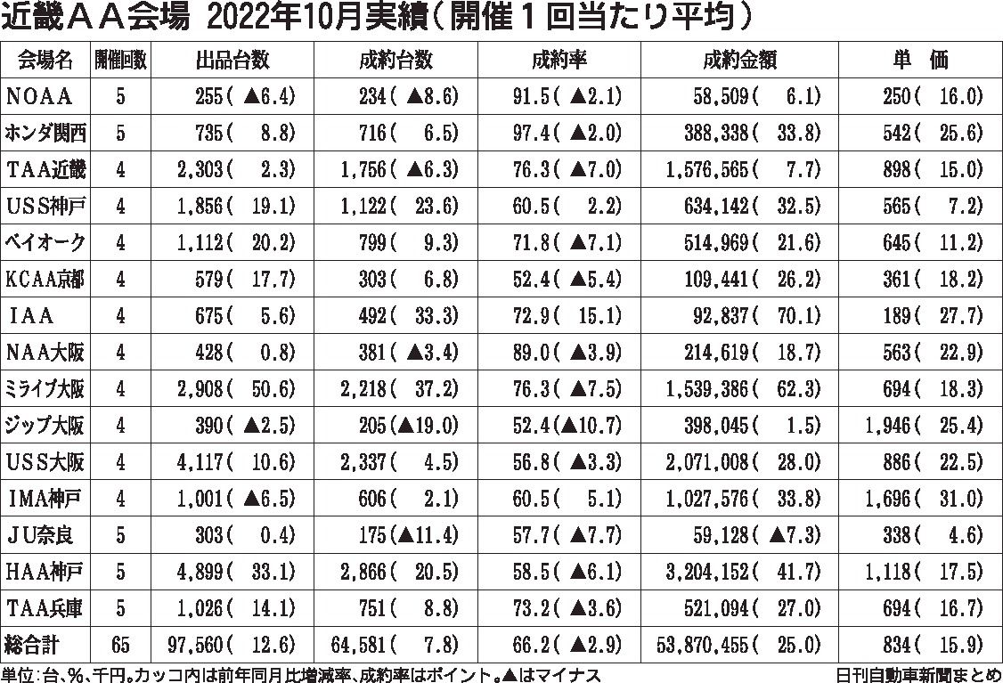 近畿地区にある中古車オークション(AA)15会場の10月実績(1開催当たり平均)がまとまった。開催回数は前年同月と同じ65回。出品台数の総合計は前年同月比12・6%増の9万7560台で、7カ月ぶりに前年台数を上回った。総合計が9万台を超え...