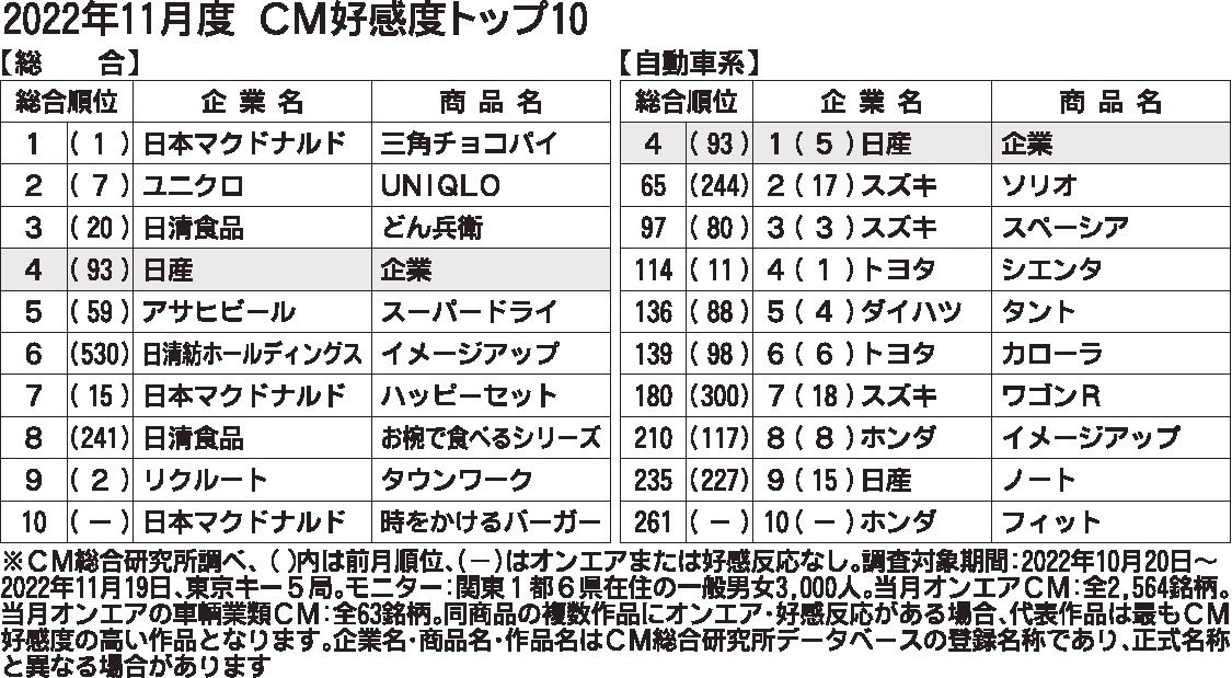 CM総合研究所(関根心太郎代表、東京都千代田区)は、2022年11月度のCM好感度ランキングを公表した。総合ランキングでは日産自動車の企業CMが前月の93位から4位に急浮上した。自動車業類のトップテン入りは2カ月ぶり。首位は前月に続き日本マクドナルド「三角チョコパイ」だった。また日清紡ホールディングスのイメージアップCMがトップテン入りした。