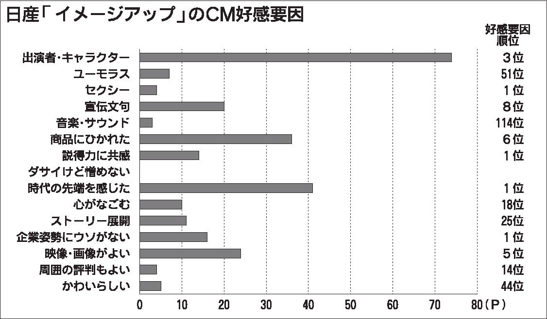 自動車業類では日産の企業CMが4ランク上昇し首位、スズキ「ソリオ」「スペーシア」が2、3位を占めた。またホンダ「フィット」が圏外からトップテンに入った。