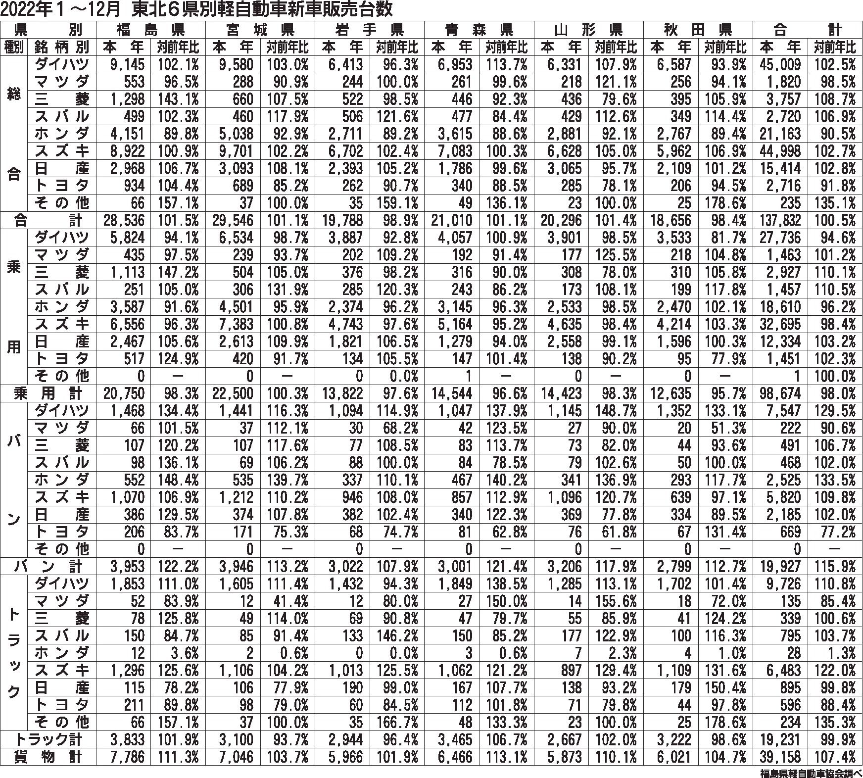 〈2022年1~12月 東北6県別軽自動車新車販売台数〉