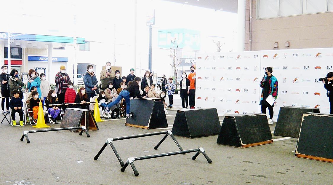 【松山】トヨタカローラ愛媛(松田卓恵社長)は、松山市内の本社・中央通店でアーバンスポーツ、パルクールの発表会を披露した=写真。同店では2022年7月からパルクールスクール「EHIMEミキシングパークCK」を共同事業で立ち上げている。地域の...