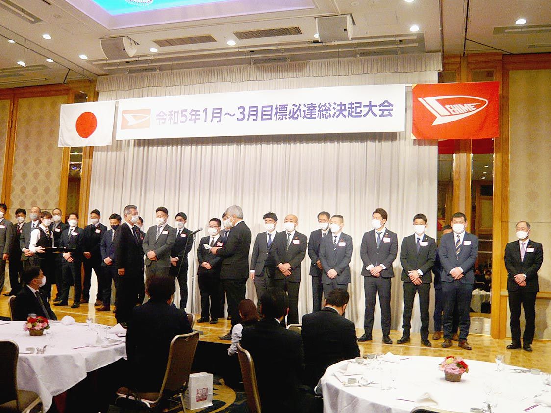 【松山】愛媛ダイハツは、松山市内のホテルで「1~3月目標必達総決起大会」を開催した=写真。 同大会は販売店表彰式の終了後に開かれ、1~3月の新車販売目標台数の達成などを出席者全員で誓った。 席上、一色社長は「ピット店からの協力をいただき、...