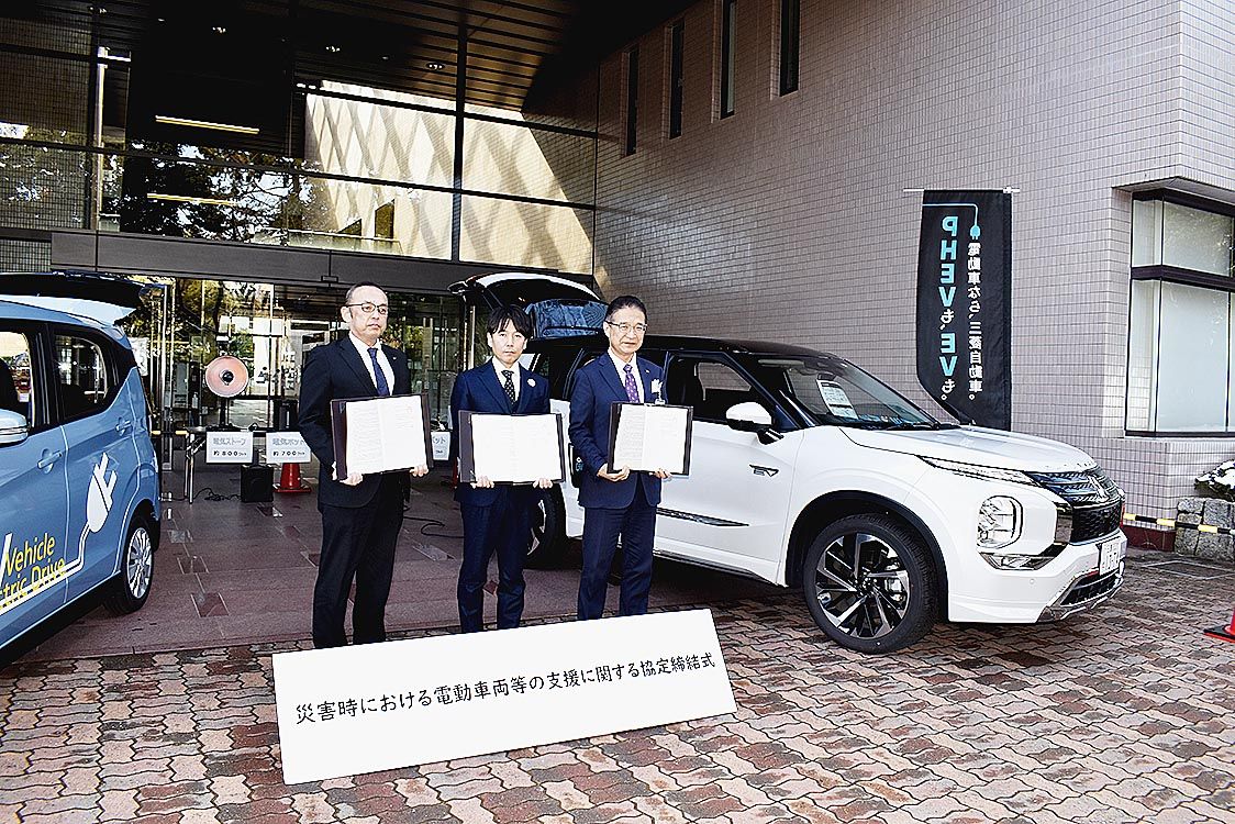 【津】三重三菱(出口哲也社長)と三菱自動車は、津市と「災害時における電動車両等の支援に関する協定」を締結した。津市で災害が発生した場合、両社が所有するプラグインハイブリッド車(PHV)などを活用する内容。停電時に電気機器や通信機器などが使...