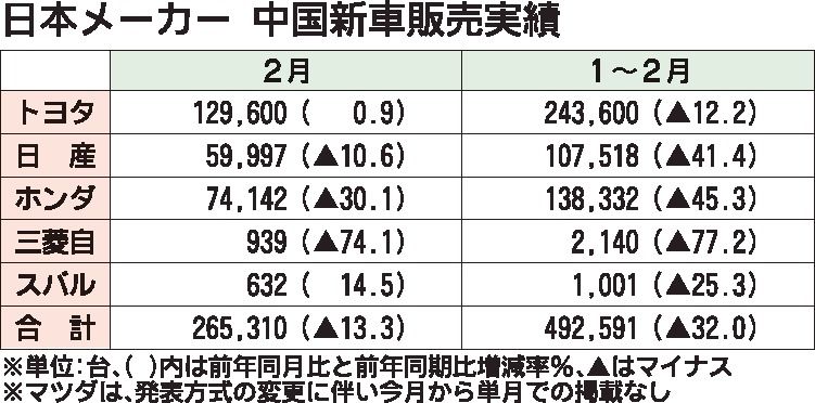 日本の自動車メーカー5社の2月の中国新車販売台数は、前年同月比13・3%減の26万5310台と5カ月連続で減少した。中国政府による自動車取得税の減税や電気自動車などへの補助金が終了したことが影響した。 ホンダは7万4142台(前年同月比3...