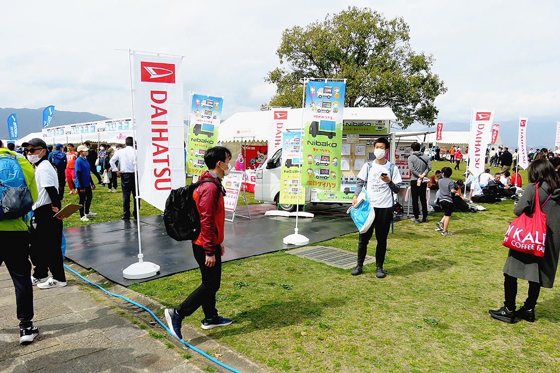 【大津】滋賀ダイハツ(鳥居和浩社長)は「第1回びわこマラソン」に協賛し、ゴール地点付近にブースを設置した=写真。スポーツ大会への協賛を通じ、地域貢献とダイハツブランドの浸透を図るのが狙いで、ダイハツ工業の軽トラックを活用した移動販売車「ニ...