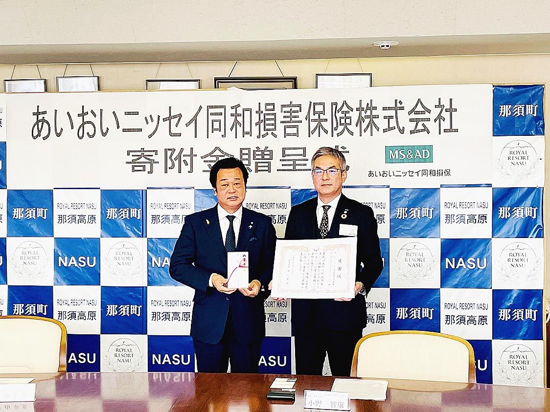 【宇都宮】あいおいニッセイ同和損害保険栃木支店(小野智康支店長)は27日、那須町(平山幸宏町長)に浄財を寄付した。同町は同社と2021年に包括連携協定を締結した経緯もあり、今回の寄贈先に選ばれた。那須町役場で行われた寄贈式で小野支店長が平...