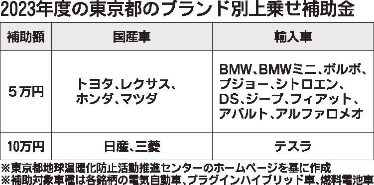 都の制度は電気自動車(EV)とプラグインハイブリッド車(PHV)、燃料電池車(FCV)が対象。23年度の補助対象ブランドや具体的な補助額は4月28日に明らかにし、申請の受け付けも同日から開始した。
