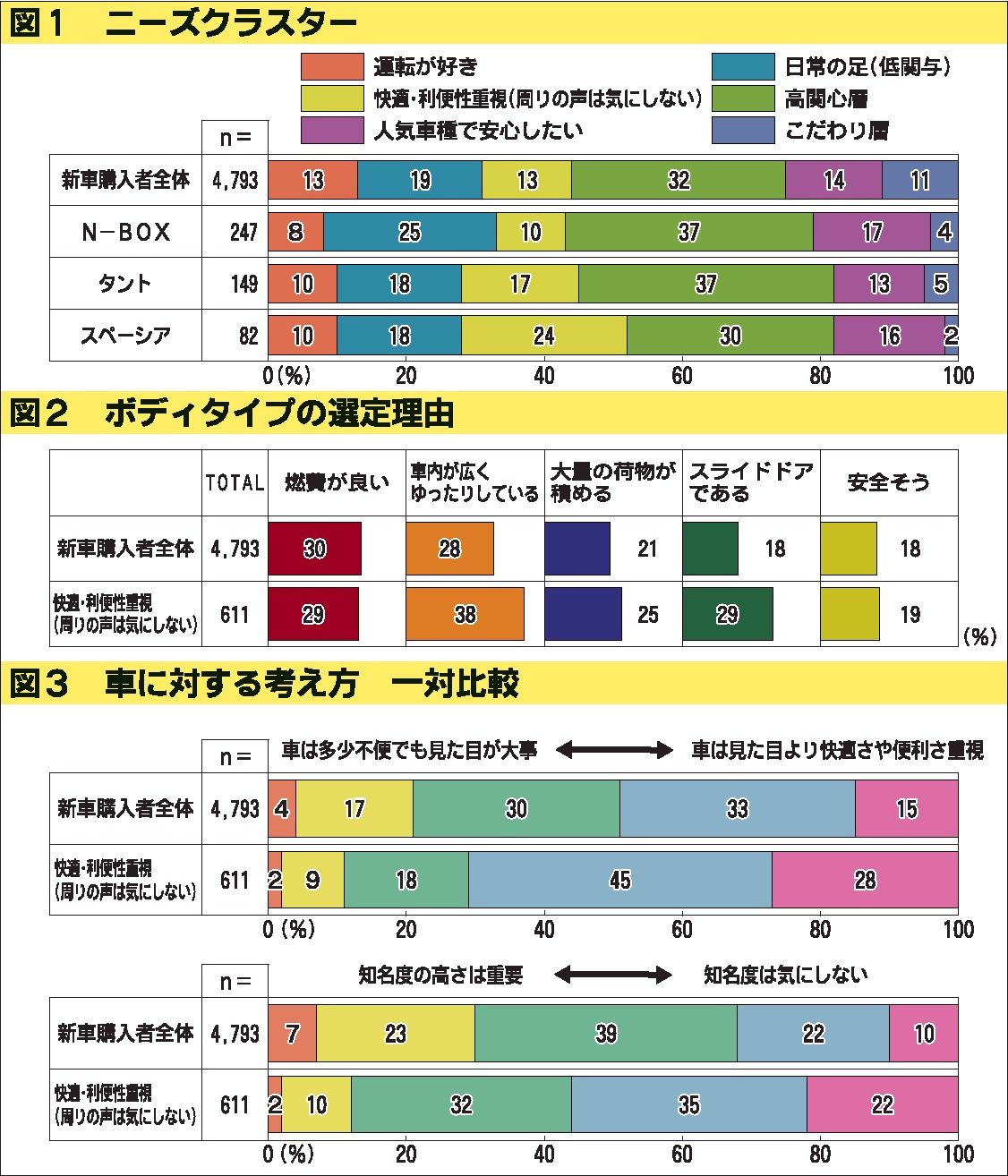 3回目の今回は、3車種(ホンダ「N─BOX」(エヌボックス)、ダイハツ「タント」、スズキ「スペーシア」)のユーザーを、「車に対するニーズ(重視点)」という特定の商品に対する意識・考え方の観点から分析していきます。車種ごとのキャラクターをニ...