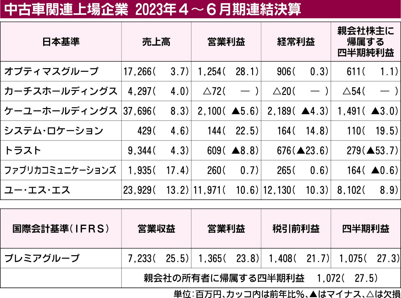 中古車関連の上場企業のうち4月から翌年3月を事業期間とする企業の2023年4~6月期決算は、各社の売上高が増収となった。国内外における新型コロナウイルス感染症の影響が収束してきたことなどが要因だ。 小売業では、カーチスホールディングスは中...